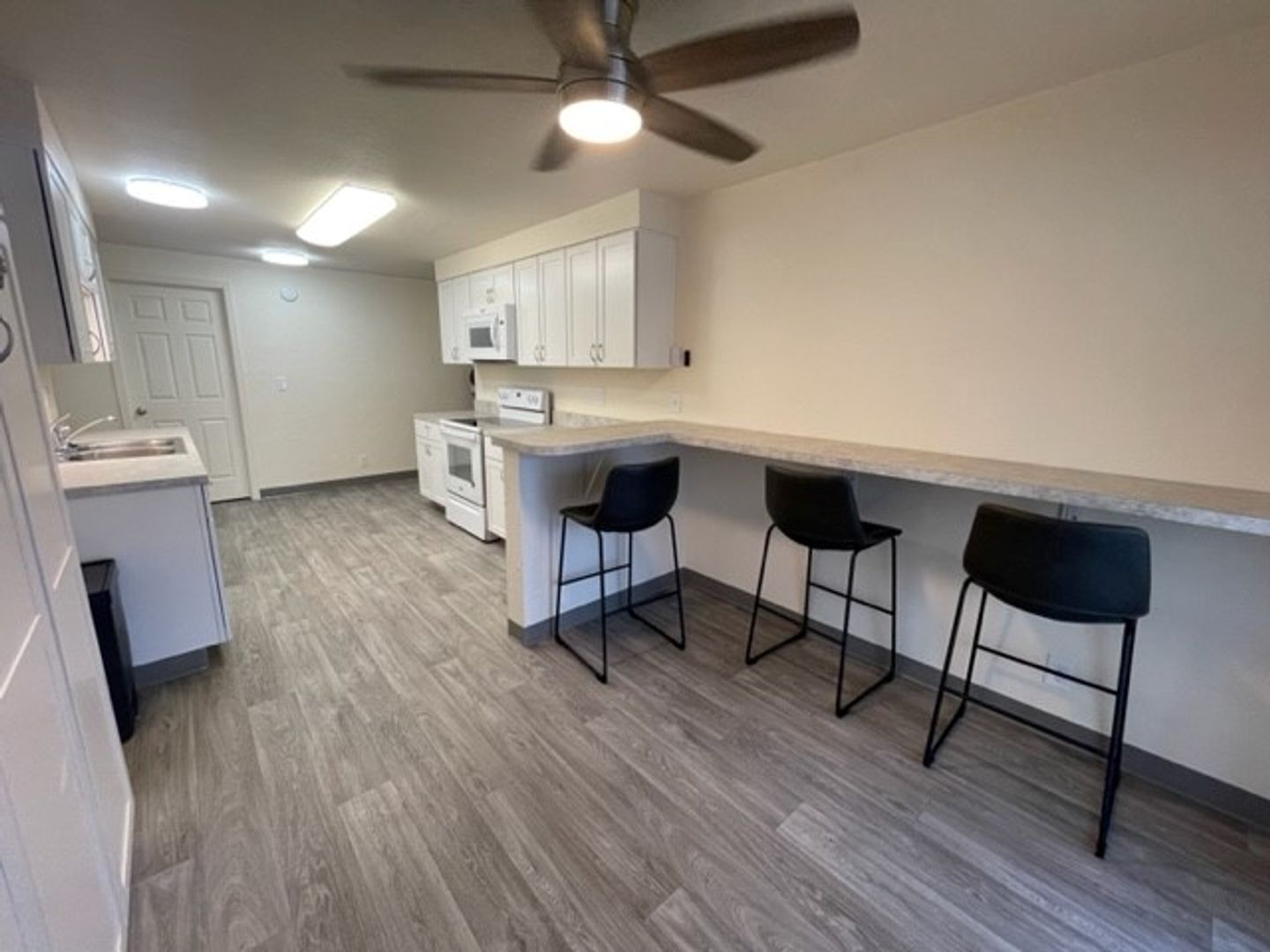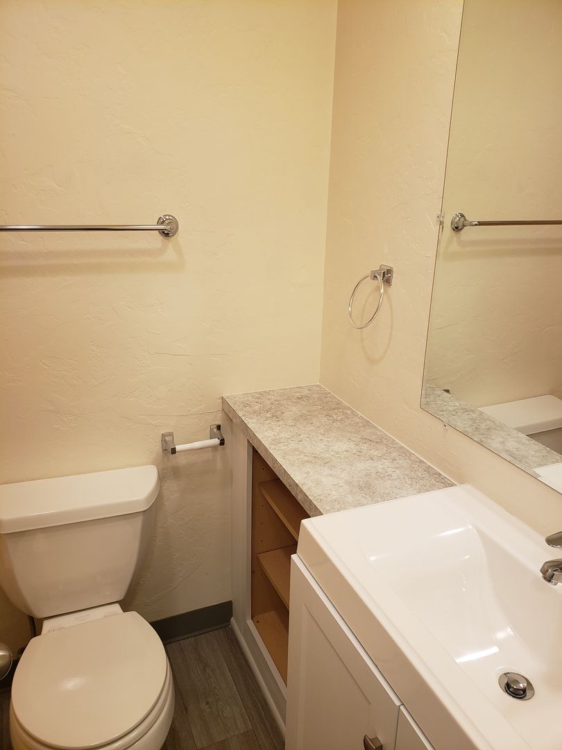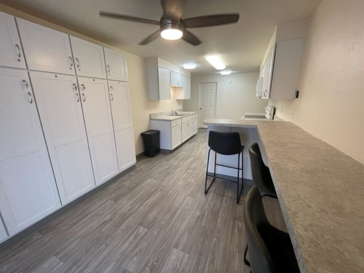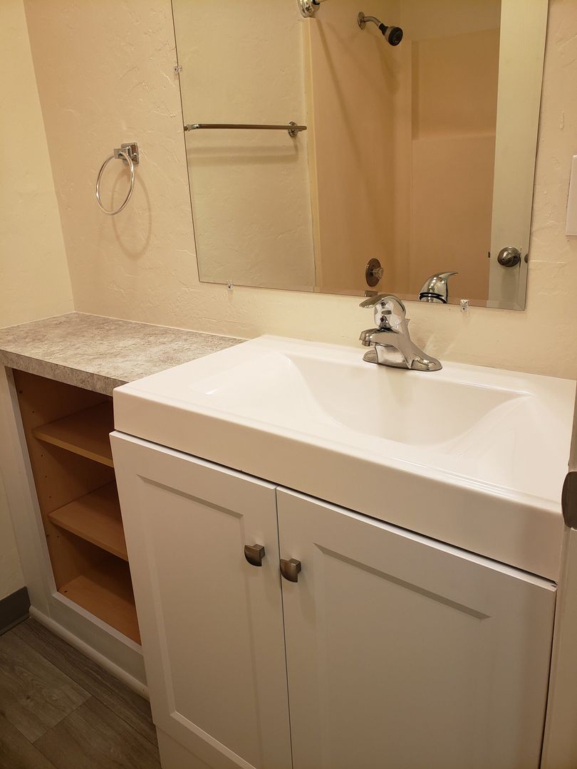 Newly updated quint on campus with private bedroom and bath! Newer flooring, counters, bathroom vanity, window covering, refrigerator, light fixtures, etc. Locking personal cupboards in large shared kitchen. On site laundry and free parking. Common area cleaning provided. Shared kitchen